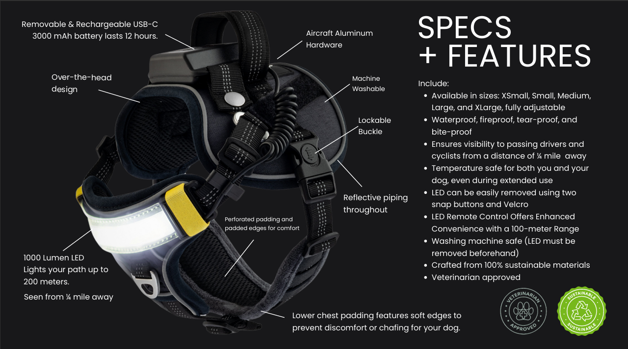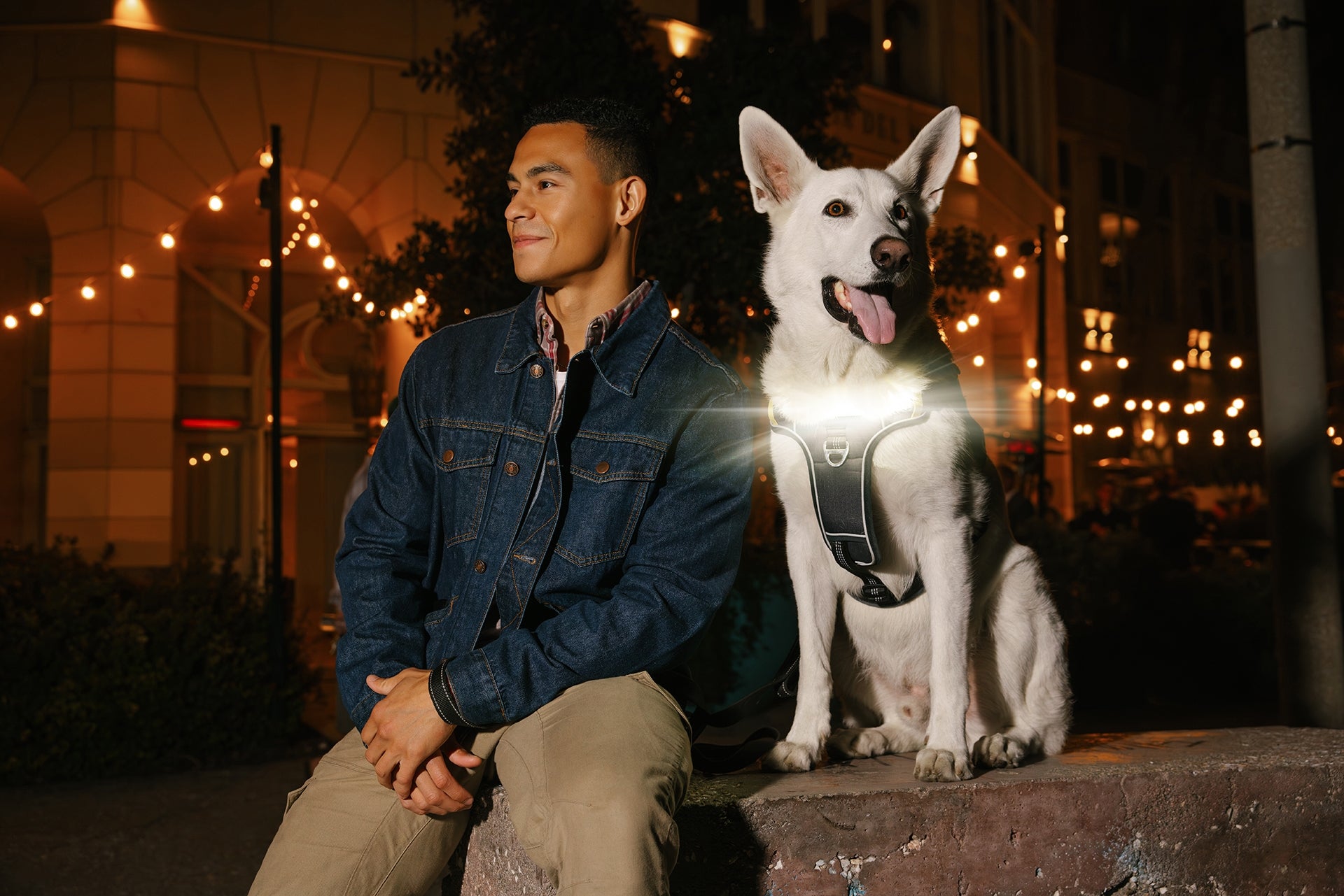 A carefully designed everyday harness that illuminates your path, giving you and your pup advanced visibility at any time of day.
