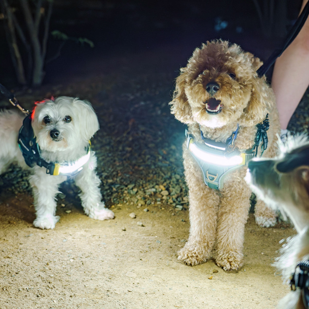 The Lumi All-in-One Night Walking Safety Kit includes four essentials designed to keep you and your dog visible, comfortable, and confident on every evening stroll.