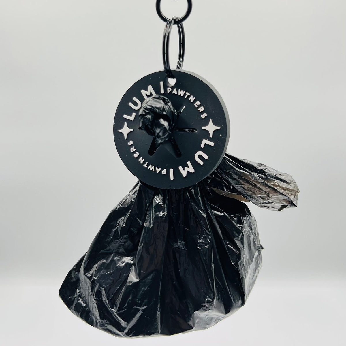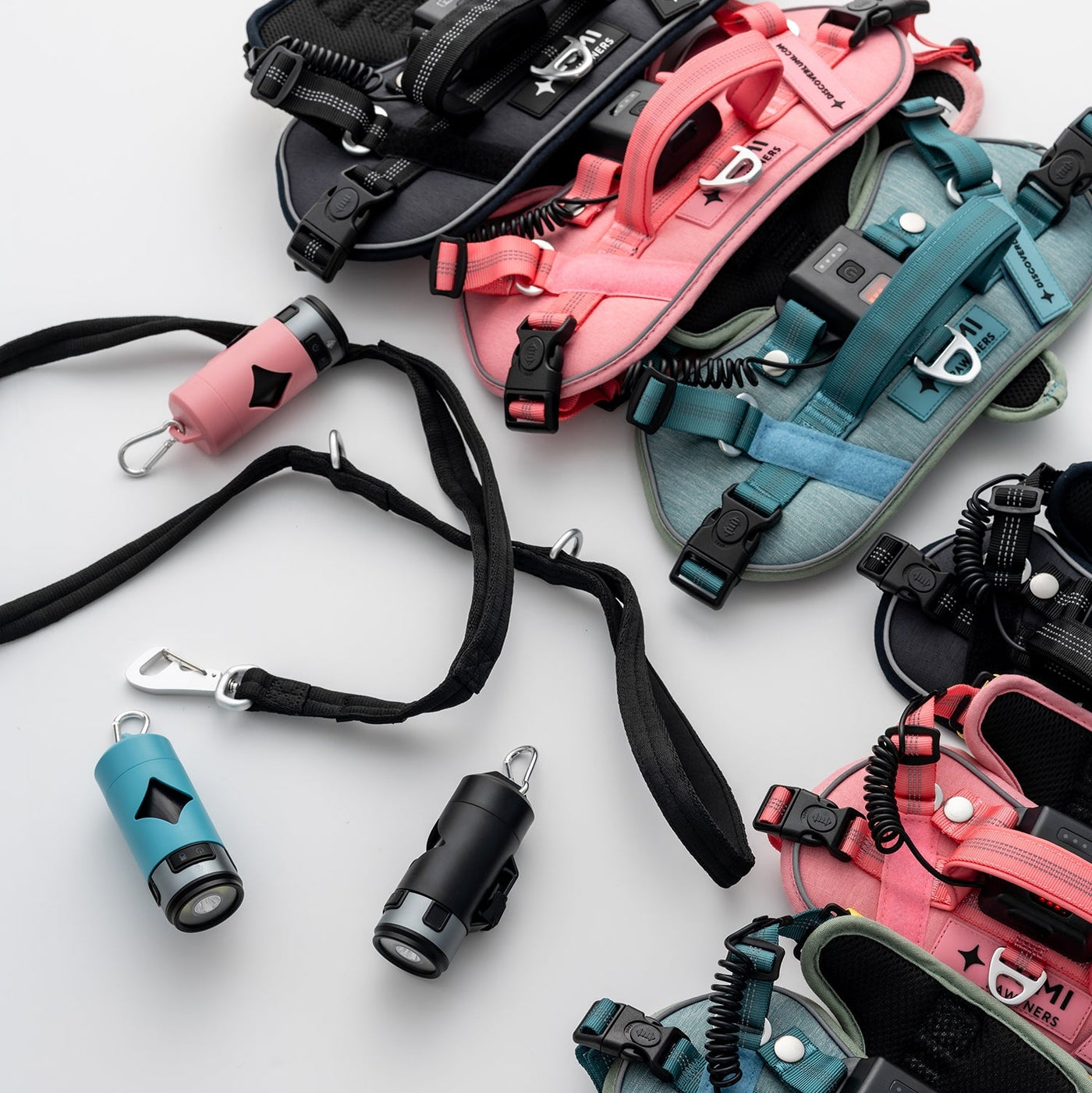 A 500-lumen mini flashlight + bag holder in one. Clips securely to your leash with a locking carabiner and holds a full roll of bags. Includes 9 light modes (white spot, flood, red light, flashing) and a 6-hour battery life—perfect for nighttime walks and extra visibility when you need it.
